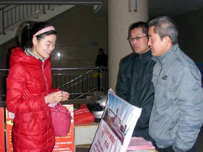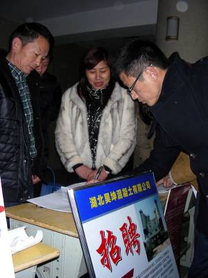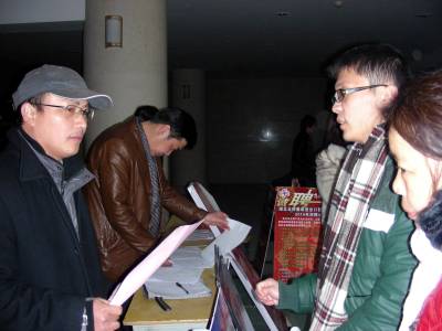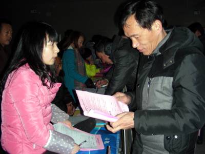 2月5日,外出务工返乡人员在黄梅县黄梅镇招聘会咨询台前应聘。该县抓住春节前后农民工集中返乡的时机,把招聘会开进基层乡镇,送岗位到农民家门口。自去年腊月二十一日至今,已在9个乡镇举办2014年“春风行动”招聘会12场,邀请100多家企业同时进场,提供招聘岗位1万余个,吸引了2万多名求职者应聘,让众多“候鸟”不再远飞他乡,在家门口就业。(本报视界网 吴志雄 摄)