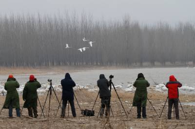 2月4日,在三门峡黄河湿地天鹅保护区,来自全国各地的游客和摄影爱好者冒着严寒观看、拍摄天鹅。每年10月至次年3月,万余只白天鹅在此越冬,成为三门峡市的独特景观。