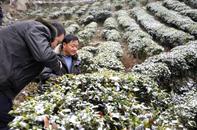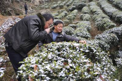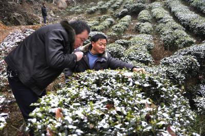 “土专家”指导促增收 2月9日,在恩施市红土乡天落水村有机茶园里,农技人员正在察看雪灾后茶叶生长情况。 连日来,雨雪凌冻天气交加,该乡组织农业、茶办等“土专家”,深入到茶叶田间地头,察看雪灾冻坏对春茶嫩芽的影响,及时指导茶农清理树冠上的积雪,防止因积雪过厚压伤茶树。为春茶提高产量、质量打下好的基础,帮助茶农增产增收。(本报视界网彭绍峰摄)
