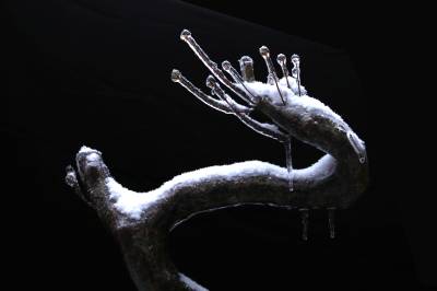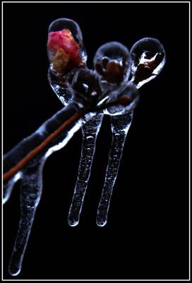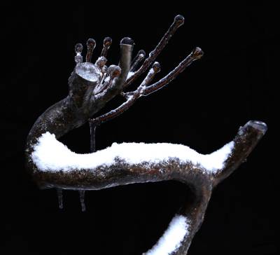 造型奇特的杜鹃树,部分提前开放的杜鹃花在冰雪的包裹和映衬下,傲然而立,别具一番风味。