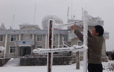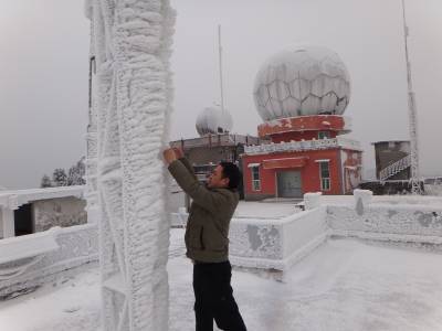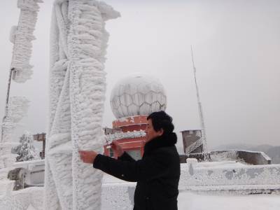 图一:气象观测员李朝晖冒雪测量电线积冰。