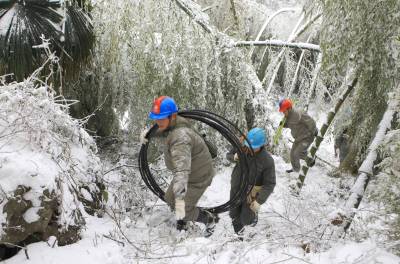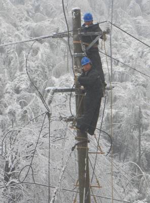 2月10日,国网湖北咸宁供电公司员工在咸安区汀泗镇星星村抢修受灾的10千伏配电线路。从8日开始的低温冰冻雨雪,导致湖北咸宁山区的楠竹大面积受灾,被冰雪压弯和压断的楠竹将10千伏配电线路压断。灾情发生后,国网咸宁供电公司组织抢修突击队顶风冒雪突击抢修,至10下午18时,大部分被楠竹毁损的配电线路恢复供电,保障了山区居民的春节用电。