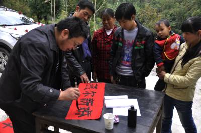 民俗事项说明:图片反映的是结婚写对联2012年9月30日,在恩施市红土乡石灰窑村,一农家过喜事正在“书法家”写对联。