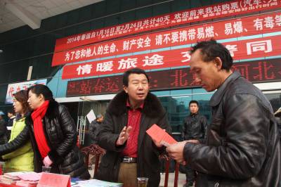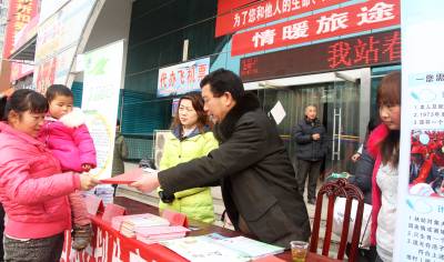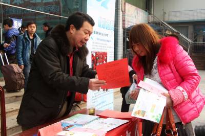 2月11日,竹溪县计生干部在汽车站发放计生宣传资料。 当日,竹溪县“春暖农民工 计生在行动”活动在该县汽车站举行,计生部门发放计生宣传资料5000余份,2000余元免费计生服务用品,为外出农民工送去春日计生关怀。与此同时,该县还在河北、广东等地区成立25个驻外流动人口协会,为在外务工人群提供贴心的计生服务。(本报视界网颜义众 汪敏)