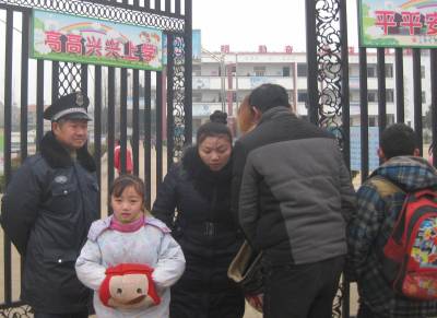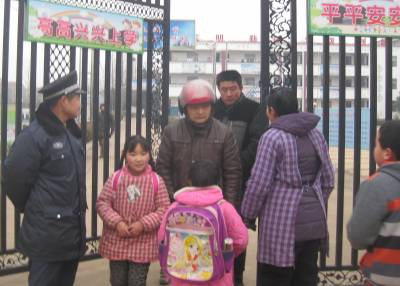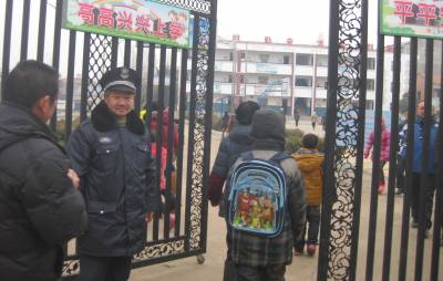 2月12日,新年开学的第一天,安陆市王义贞镇中心小学保安王青钊正在校门口迎接来校报名的学生和家长。为确保学校师生安全,维护正常的教育、教学秩序,安陆市政府出资150余万元在全市公开招聘了100名保安,此举有力地保护了该市86所中小学5万余名师生的安全。 (本报视界网:王代金 摄影报道)