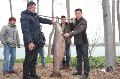 12日,潜江市运粮湖管理区职工周清武在一废弃鱼坑中用鱼钩挂起一条青鱼,据测量,该鱼身长1.4米,背宽0.35米,重72斤,引来人群围观,大家无不啧啧称奇。据当地百姓称,如此巨大的青鱼在家鱼品种中实属罕见。本报视界网 刘军 叶标 摄