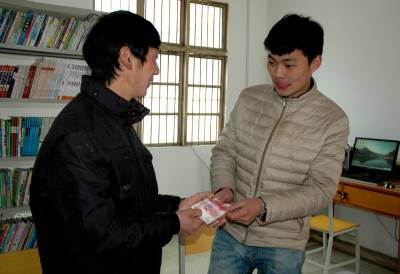 北京航空航天大学飞行学院本科生陈浩,从北京回到谷城县南河镇白水峪村的家中过年。在除夕前一天下午,他不顾个人安危奋力抢救开着小轿车坠入白水峪电站水库的村民梁先军父子。为了感谢救命之恩,梁先军给陈浩包了2000元钱的红包。陈浩多次拒收,梁先军还是执意放到陈浩家里。2月12日,陈浩(右)把这2000元钱捐给了白水峪小学资助家乡贫困学生,校长谭承斌接过钱后代表贫困学生深表谢意。