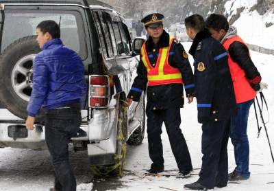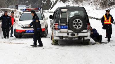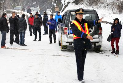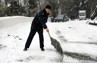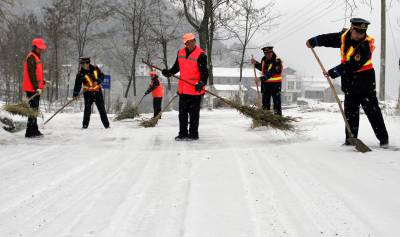 2月11日晚和12日,竹溪境内普降大雪,使高山公路结冰雪积雪,12日早晨6点,竹溪县公路局全体干部员工全员出动,分布到各条结冰积雪路段扫雪防滑,铺防滑料,强调和协助没戴防滑链行驶积雪路段的司机戴上防滑链链,在积雪路段指导车辆行驶路线等,护送车辆安全通行,路政执法车辆从前面开道,检验积雪路段可否安全通行情况,保证农民工节后还岗高峰春运车辆行驶安全。(视界网温大树摄)