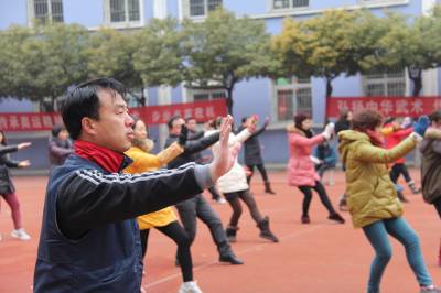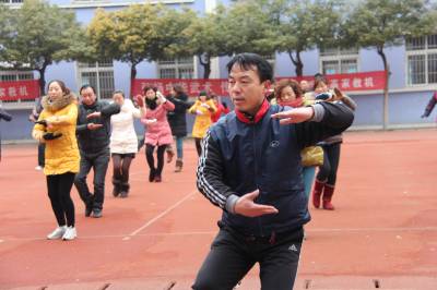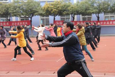 2月12日,开学第一天。丹江口市张家营小学53名教师迎着早晨的第一缕阳光打太极拳,向着新学期的目标冲刺!(本报视界网 钱芹 金晓 摄) 详细通联:丹江口职业技术学校办公室:钱芹 邮政:442708 手机:13477990812