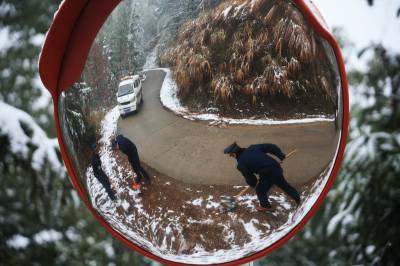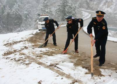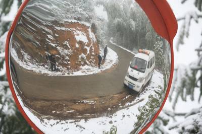 2月13日,湖北省武穴市交通运输局农村公路局护路队员,在清除海拔800米的横岗山区公路上的积雪、杂物,疏浚边沟,确保所辖的道路安全畅通!武穴市农村公路达1600多公里,其中未纳入列养的就达1300多公里,“建、管、养”的重担全部压在该市农村公路局的头上,为保障安全畅通,该局从去年腊月初开始,就对所有路段的边沟、涵洞、路肩和路况进行一次拉网式检查,做到心里有一本账。元宵节的到来,恰逢又是信众朝圣和农民打工出行的日子,武穴市农村公局对刚下大雪的横岗山区重点巡查,保证所有进出山的人群安全出行。(冯怡红摄)