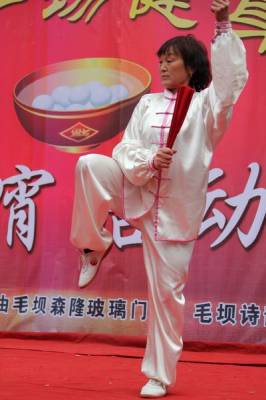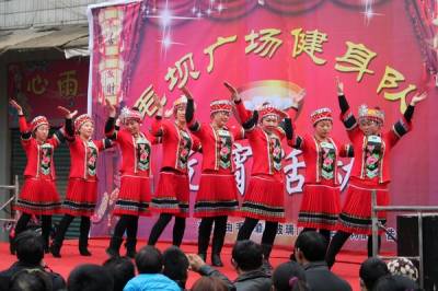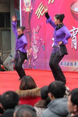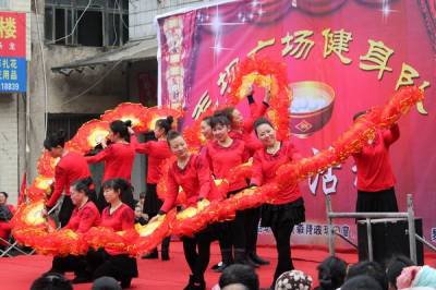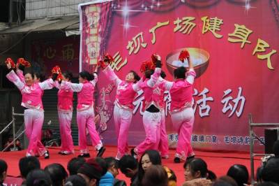 2月12日,利川市毛坝镇政府门前广场上,毛坝坝广场健身队全体队员们欢聚一堂,载歌载舞,喜迎2014马年元宵佳节。