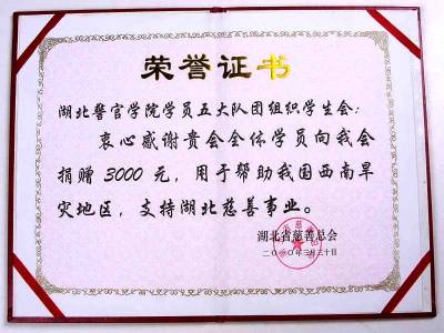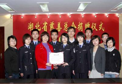 前我国云南、四川、贵州、广西等省区遭遇的百年一遇的严重旱灾,为响应团中央的号召,湖北警官学院学员五大队团总支、学生会代表一行6人于3月30日将捐款3000元转交给湖北省慈善总会。据了解在此之前,湖北警官学院学员五大队团总支和学生会已发出倡议,号召全体团员学生奉献爱心,每人向灾区群众捐出一箱饮用水。在募捐现场,慈善总会的工作人员热情接待了学生代表,并颁发了证书,与学生代表亲切合影。省慈善总会的工作人员还希望大学生青年志愿者积极参与他们组织的各项社会公益类活动。学生代表们表示将积极参加省慈善总会组织的各项活动,为社会奉献爱心,为创建和谐社会贡献一份力量。(周林利摄影报道)