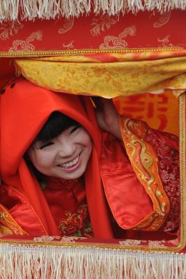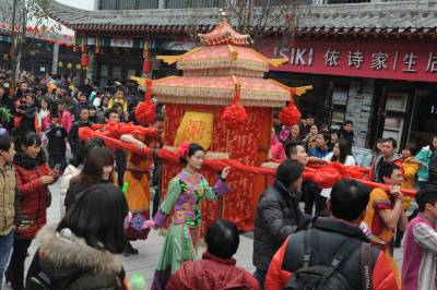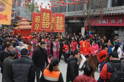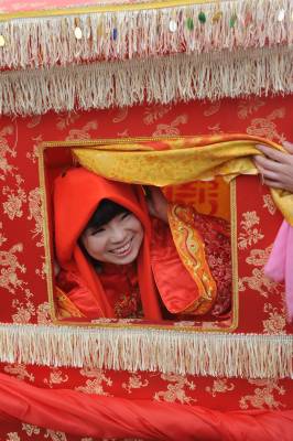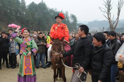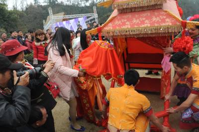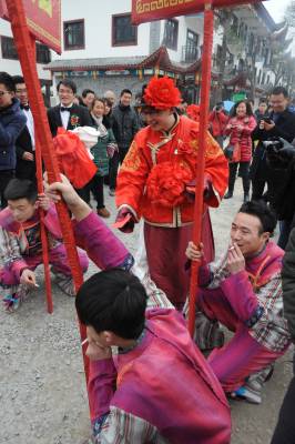 当日,在湖北省恩施土家族苗族自治州土家女儿城里,坐花轿、骑骏马,在轿夫的号子和人群的见证下,一对情侣通过传统土家民俗婚礼方式过特别的情人节,上演了一场民间土家族传统、低碳婚礼。 视界网 谢顺 摄 恩施市新闻中心记者 谢顺 13277590198