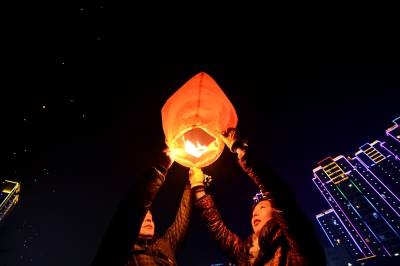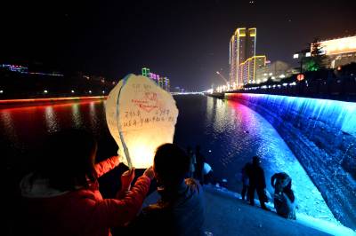 当日是西方情人节,又恰逢中国传统的元宵节,保康县许多情侣们来到县城清溪河畔,放飞写有心愿和祝福的“孔明灯”,表达心中的爱意,见证甜蜜的爱情。(本报视界网 杨韬摄)