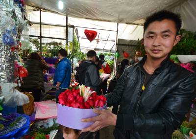 2月14日,元霄节、情人节火了湖北省十堰市张湾花市。在张湾区车城街办张湾花市,一位姓郑的先生手捧爱心玫瑰说“一花难求,我3天前预定的,现在取还等了1个多小时”,另一对情侣则选择了几盆马啼莲等鲜花欢心而归。据店主涂女士讲,当天可以卖60多束鲜花,每束180元,卖盆栽鲜花50多盆,每盆50至100元不等,当天可赢利近万元,比过年还高兴。笔者从其它几家花店了解到,销售情况与涂女士差不多。随后笔者又到了张湾区汉江路食品沟花卉市场和张湾区车城街办大岭路花卉市场,两个花卉市场同样火爆,卖花与买花相互在讨价还价。