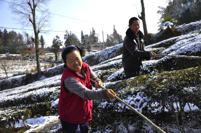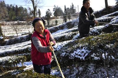 茶园里“赶”雪忙 2月18日,在恩施市红土乡乌鸦坝村有机茶园里,赵泽武夫妇正在“赶”雪,保护芽茶正常生产。 连日来,因冰凌低温天气的影响。该市及时组织农业、茶办、专业合作社技术员,指导茶农春管。当地茶农纷纷走到田间地头,采取开沟上肥、深耕除草、防病治虫、修剪枯枝等措施,确保今年春茶早产高产,增加茶农收人。(本报视界网彭绍峰摄)