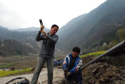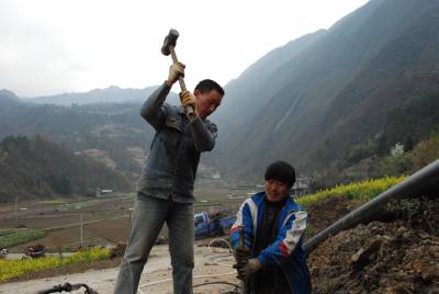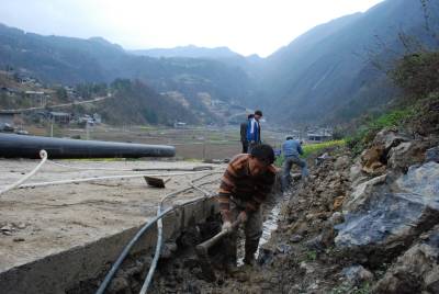 4月1日,工人们正在开挖沟渠,抓紧铺设治涝发电的专用水管。五峰土家族自治县牛庄乡池南村在农田整治工程中,筹资修建排洪设施,将引起涝灾的溪水引入王家河水电站水库,既治理了涝灾,又增加了发电量。(本报通讯员肖永奎摄)