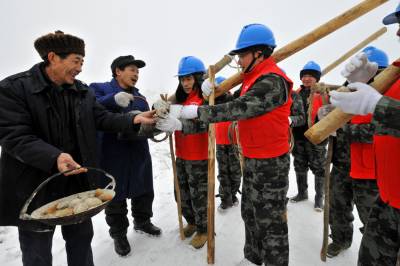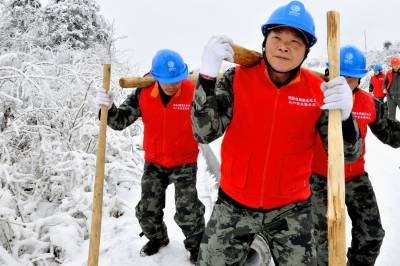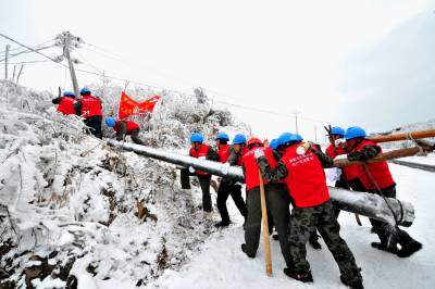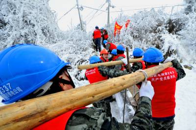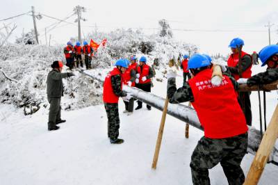 2月18日至19日,海拔1500多米的利川市齐岳山仍是一派冰天雪地的景象,国网湖北利川市供电公司共产党员服务队,踏着厚厚的积雪、喊着震天的号子将一根根水泥电杆抬到被覆冰毁损的旧电杆处,以尽快修复配网,让因新一轮冰雪灾害造成停电的部分用户早日恢复供电。