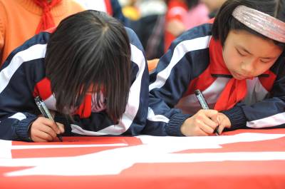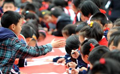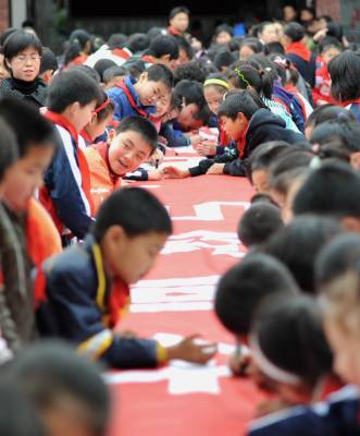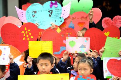 4月1日,恩施市实验小学的学生们正在展示亲手制作的爱心卡。当天,恩施启动”捐一瓶水,献一份爱”红领巾情系灾区手拉手捐赠活动,广大土苗儿女以捐款、制作爱心卡等方式向灾区献出了自己的爱心。