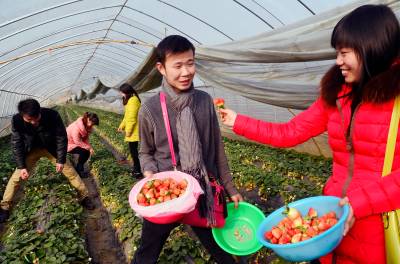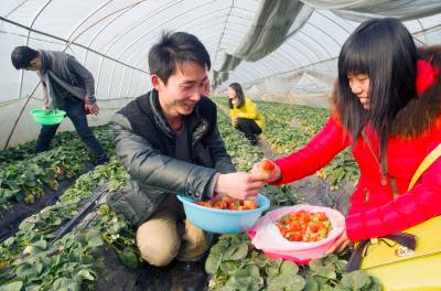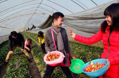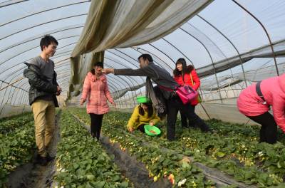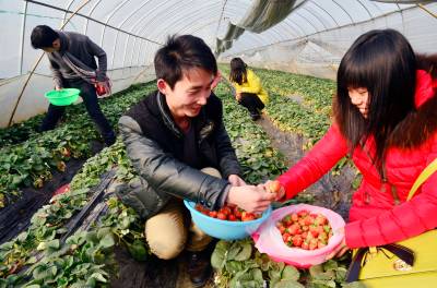 20日,在云梦县伍洛镇顺河村的草莓大棚里,过路的游客正在体验采摘草莓的田园乐趣。据种植户程师傅介绍,他夫妻俩种植草莓有10年了,种植面积3亩。过去,他们要自己采摘了去集市上推销;如今,名气大了,主要供游客和周围的城乡居民自己采摘,平均每天接待游客二、三十人,供不应求,每年收入5万余元。 ( 王云清 宋慧敏 摄)