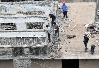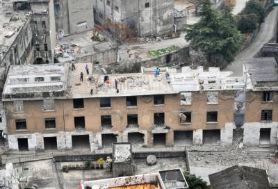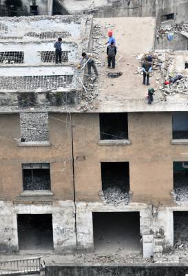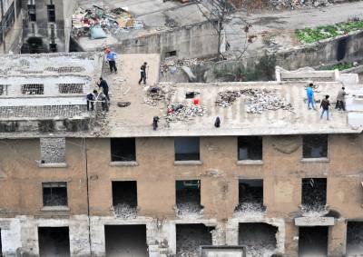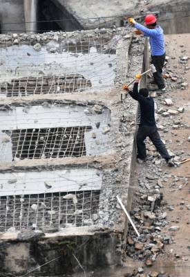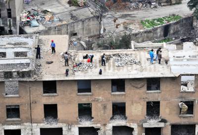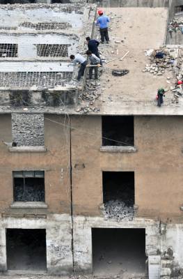 23日,工人在拆除巴东县信陵镇黄土坡社区原公路局宿舍。 据了解,黄土坡滑坡区域内需拆迁的单位有74家,单位宿舍楼47栋,工矿企业13家,副业设施22处,拆除面积68.87万平方米。随着巴东江北神农溪小区的崛起,黄土坡滑坡体上的居民搬迁、房屋拆除同步进行。目前,已完成原巴东一中、人民医院、教育局、电影院、工行等人口密集区和危险区房屋拆除和废弃物清理、分类处理等工作。(本报视界网 梁勇 摄)13986846069