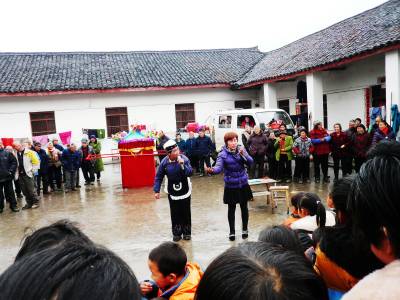 “到福利院看戏啰!”2月24日,细雨霏霏中,郧县五峰乡南北峰村农民演艺队来到乡中心福利院,为老人表演“抬花轿、赶竹马、夕阳红、我为老人贺新春”等系列专场剧目。该院百余位老人和附近居民兴致勃勃地观看了上述充满乡土味的节目,心里暖意浓浓。(本报视界网周宗华摄) 作者地址:郧县五峰乡政府