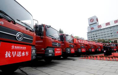 昨日上午,东风公司支援抗旱救灾捐赠饮用水发车仪式在张湾青年广场举行。13辆大卡车满载85吨”爱心水”驶向重庆灾区。当前,我国西南5省市区正遭受特大干旱,灾区广大城乡居民饮水困难。东风公司总部、党委积极响应胡锦涛总书记和党中央的号召,决定向重庆灾区捐赠10万瓶瓶装饮用水和2500桶桶装饮用水,共计85吨,价值20万元。本报签约摄影师张启国摄