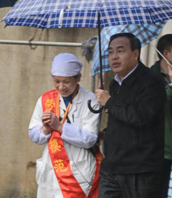 武汉市市长唐良智为劳模犟妈易勤打伞遮雨