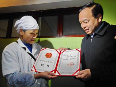 2月24日下午,武汉市市长唐良智,在国际三八妇女节来临之际,代表市委市政府市总工会,冒雨来到江汉区汉兴街辖区的东方红食品有限公司,亲切看望慰问了犟妈易勤,提前向她祝贺节日,在视察过程中,唐市长为她打伞遮雨,(图1)。市长唐良智(右)代表市政府为易勤颁发了武汉市劳动模范证书和奖章,还代表市总工会颁发了10万元的帮扶资金,让她感动万分,决心要继续为政府分忧,搞好智障青年的再就业,回报党和政府社会各界的关爱(图2)。