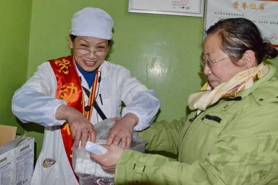 2月24日下午,一位女消费者慕名从汉阳乘车冒雨来到了武汉市东方红食品有限公司,购买了由智障青年工人生产的10盒奶糕,刚刚由武汉市长唐良智颁发荣获了该市劳动模范证书和奖章的"犟妈"易勤(左),还来不及摘下奖章和缎带,就热情地接待了这位消费者。这位消费者高兴对易勤说;"你是一个慈善家,我是慕名而来的,因她有一个亲戚一直用他们公司生产的奶糕,质量信得过,口感好,吃得有味,就送一盒她,她拿回家让家人品尝后,都感觉非常好,所以乘了1个多小时的公汽,特意前来购买回家。