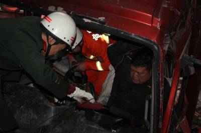 2月25日上午7时许,当阳市两河镇两河大桥附近,一辆载有50吨货物的大挂车撞进路旁的厂房,造成房屋倒塌,司机被困车内。接到报警后,当阳消防大队官兵迅速赶到现场,利用液压破拆工具成功将被困司机救出。目前,事故原因正在调查,被困司机经过救治已无大碍。(李帅摄)