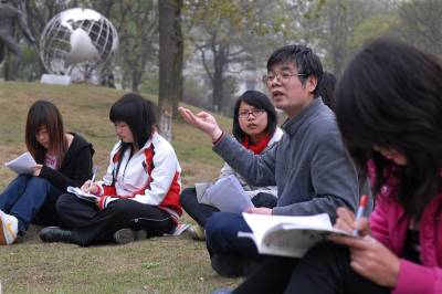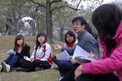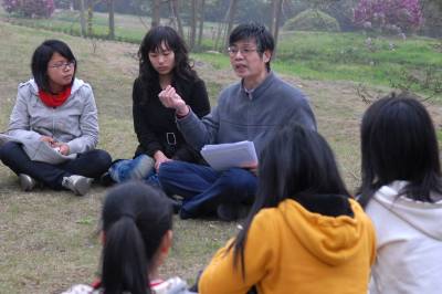 2010年4月1日,湖北经济学院积思河畔自然生态林山坡上,该校新闻传播学系副教授钟一鸣为热爱写作兴趣的同学讲解母语应用,辅导文学创作,让春天的小山坡增添了几许书香。