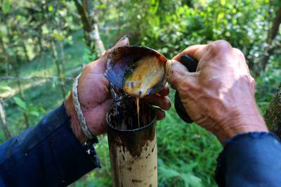 割漆是个又脏又累的活儿,生漆不是人人都能接触,因此真正能够从事割漆技艺的人本身就并不多。割漆技艺看似简单,却有着诸多讲究。漆树被斜着割开月牙形的小口后,生漆就会沿着割开的口子边缘流出来。割漆人一般用长约10厘米且要硬一点的树叶,对折再对折后形成一个小的容器,插进口子下方,让生漆慢慢流入树叶中,一两小时后便可收漆。在一棵树上一般每隔80厘米左右,可交错开口割漆,口子每周可割一次,每割一次便增大一点,一个口子一年内可割20次左右。割开的口子经过三五年又会重新合拢。割漆的季节一般都在6至9月,割漆人必须在晴天进山,并且每天都在漆树上攀上爬下,所以尽管天气炎热他们仍然要穿着很厚很耐磨的衣裤,在炎炎夏日中辛勤劳作。