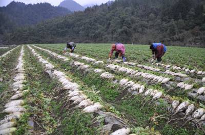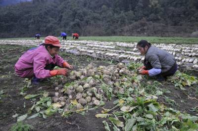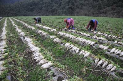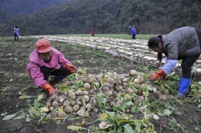 2月26日,恩施市盛家坝乡下云坝村村民陈龙俊和同组村民们正在蔬菜种植基地采收大头菜、萝卜。 据陈龙俊介绍,这段时间正是大头菜、萝卜集中采收的时间。每到这时候,附近的村民都来帮忙。据悉,盛家坝乡共有蔬菜基地8000多亩,蔬菜种植大户20多户,到了蔬菜采收的时间,附近的村民都过来帮大户采收蔬菜,并获得一定的劳动报酬,一个月可以挣1600元。近年来,该乡鼓励特色产业发展,培植大户,当地特色产业大户、工矿企业、加工业共吸纳当地农民900多人就业。 视界网 刘伦 沈宏臣 沈娟 摄
