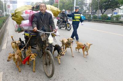 湖北黄石市一位老人骑着三轮车拖了满满一车破烂行驶在颐阳路八卦嘴路段,一群狗被铁链拴在三轮车左右与同行。