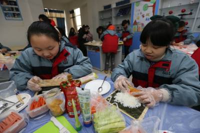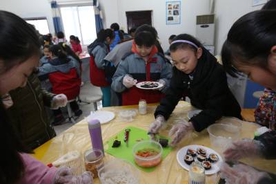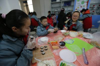 2月28日,襄阳市米公小学“小鬼当家家政社”的课堂上,60多名自带米饭、寿司紫菜、胡萝卜、黄瓜等食材的深造正跟着一名学生家长学习制作寿司。当日,湖北襄阳市米公小学“小鬼当家家政社”开展首次家政课,让学生们按年级、分批次到家政社学习生活技能,通过各种“家务”培训学习生活自理能力。