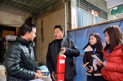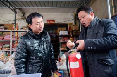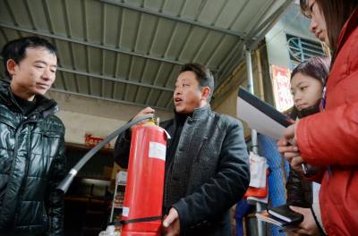 2月28日,社区消防员邹雄(左二)带着新招聘的两名网格员在云梦县云台东路向个体户王小平讲解如何使用灭火器材及有关消防安全的知识。邹雄是云梦县幸福社区的工作人员,在该社区工作15年,一直尽心尽力“为邻里守望平安,为家园筑牢防火墙”等服务,将安全风险消灭在萌芽状态,被居民亲切地称为“社区消防员”。他所在的社区连续多年无重大安全事故。去年,被推荐申报“全国和谐示范社区”,他本人连续五年荣获城关镇先进工作者。 (王云清 张利轩 摄)