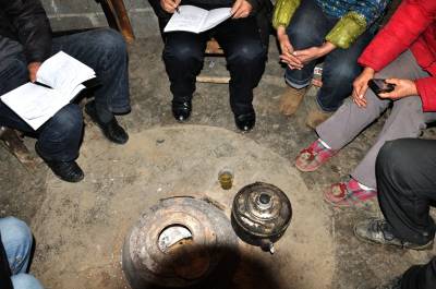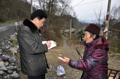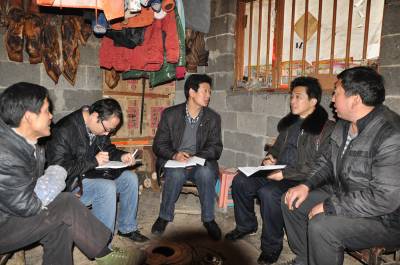 调查组成员迅速拿出笔记本,详细询问村民生活、生产情况,征求解决吃水难问题的办法,并做好记录。