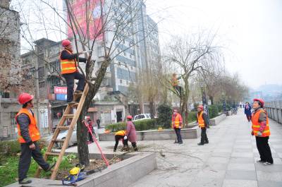 3月3日,恩施州城亲水走廊,城市园林工人正在管护行道树。为扮靓城市园林,让城市“约惠”春天,连日来,恩施市园林工人们纷纷走上街头,忙碌在城市园林绿化各个角落。
