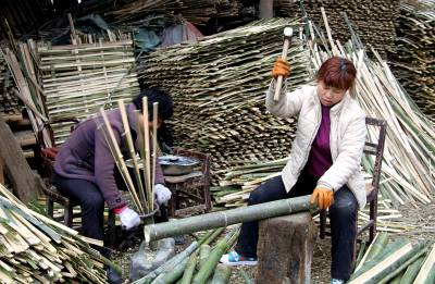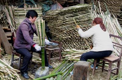3月3日,竹山县城关镇桥东村二组村民刘国福组织劳力用篾具划竹片编制“小竹板”出售。近年来,竹山县依托优势资源大力发展竹林产业,制定强林惠农优惠政策,走“公司+基地+农户”的发展模式,改造野生残次竹林,发展笋竹两用林,把竹类进行深加工,以产业带动农民致富。据林业部门统计,该县竹类品种有10多种,总面积达到20万亩。据了解,老刘把收购的竹子加工成1.2平方的“小竹板”后,县城内外慕名而来的建筑商前来挣相抢购并且每块竹板可卖到10元,仅此一项每年实现收入30万元以上。视界网(程平摄)