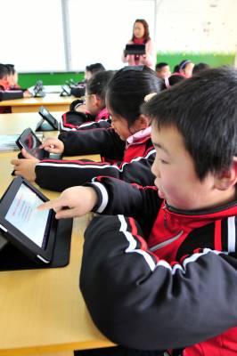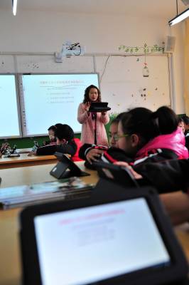 该互动课堂教学系统是利用云端服务器并在“云端”存储了课件、案例、题库、图书等丰富的教育资源,老师在课堂上通过无线网络调取“云端”上的教学内容,并通过手中的智能平板电脑终端设备将教学信息即时传达给学生,开展实时教学互动。同时,学生在课堂上通过终端设备进行课堂作业、课后学习,并与老师、同学互动交流,实现课前预习和课后复习的同步指导。通过这样一个互动系统,教师能够更加创新教学模式,构建智慧课堂,助推高效课堂,增强学习兴趣,提高学习效率。视界网王辉富、王勇 摄