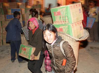 黄石三市民千里送水贵州灾区(主)历史罕见特大旱灾,给地处贫困山区的贵州省六盘水市新场乡村民们的生产生活造成了严重困难。日前,一支由我市三名爱心人士组成的志愿送水队不远千里来到这里,将价值26000元的矿泉水送到三个村的1605户人家手中,以解燃眉之急。本报记者跟随这支队伍来到旱区一线,用镜头记录下当地的灾情及王志军、邓娜和谢溪三人的爱心之行。日前,凯旋门茶艺餐厅负责人王志军看到有关西南大旱的报道后立即向自己的同学、朋友发出倡议,为灾区人民捐钱捐水。仅仅三天时间,就有20多位亲朋好友慷慨解囊,快乐音符量贩式KTV、阳新美心糖酒公司等企业也纷纷捐出善款。3月30日上午9点,黄石下起了小雨,但这丝毫没有影响"送水人"的心情,王志军、邓娜、谢溪三位市民,在朋友的祝福声中,从华新路出发,他们带着善款踏上了送水之路。经过16个小时的长途跋涉将,驱车1500多公里到达贵州省六盘水市六枝特区。沿途灾区河流、池塘干涸,农作物枯萎死亡,大片山林枯死,只剩下光秃秃的岩石,挑桶背水的人群络绎不绝。31日,在当地热心人涂文虎的指引下,王志军得知六枝特区新场乡的落龙、熊井及嘎纳三个村的旱情特别严重,经过三人的共同商议后,决定将水送往这三个村。由于当地矿泉水货源并不充足,大家经过了大半天时间的协调才凑足了所需的饮用水,而此时已是晚上9点,大家顾不上吃饭,在乡干部的带领下,兵分两路,连夜将饮用水送到落龙和熊井两个村。晚上10点30分,王志军带领的车队达到熊井村,100多位村民早已在村口等候,其中大多都是老人和小孩,他们每人背着一个大箩筐,脸上洋溢着喜悦。记者抽空来到村民陆德会家中,他正在一个大朔料盆里洗脚,陆德会告诉记者,这一盆水先要用来洗菜,然后一家5口白天洗脸,晚上洗脚,用了三天后才拿去唯牲口。开始分水了,在村干部的指挥下,现场次序井然,大家将领到的两厢矿泉水往家里背,一个小时后,650箱水全部发放完毕。准备返回时,在山边一位瘦小的女孩引起记者的注意,她叫唐学艳,今年14岁,由于父母都有病,她便带着堂弟前来背水,由于她家住在大山的另一头,所以回去还要花一个多小时翻一座山。当记者问她辛不辛苦时,唐学艳告诉记者,"不辛苦,这两箱水我们一家可以喝半个月呢"说完便转生离去,打着手电筒朝着漆黑的山上走去,她被压弯了腰的背影渐渐被黑夜淹没。几乎与王志军的车队同时,邓娜、谢溪的车队也到达了相隔10公里的落龙村,数百村民同样是大桶小桶的在村边公路上等候。在分水过程中,邓娜发现一位双目失明的老人站在人群外,神情焦急,邓娜连忙拿了一瓶矿泉水,将瓶盖扭开,递到老人手中。老人喝了一口后,满是皱纹的脸上笑开了花,"这是仙女送来的天上的仙水啊,好甜!"老人说着将邓娜的手贴在了自己的脸上。凌晨零点左右,该村780户全部领到了矿泉水。4月1日上午,送水车队又来到嘎纳村,550桶矿泉水很快被分完,一位拄着拐棍的老人得知送水的人特地从千里之外的湖北黄石赶来,他拉着王志军的手感动地说:"路途这么远,你们开车来给我们送水,是最可爱的人!"黄石日报何戈13451050117