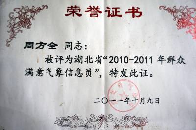 县气象局副局长李骏介绍:“老周是一个很低调、很勤劳、很负责的人,这些年为乡村群众业务发送气象部门印制的气象灾害防御挂图、12121气象宣传单、气象科普知识、重大灾害性天气预警预报等资料数以千计,收集了不少的有价值的乡村灾情实况资料,为乡村气象服务作了很大的贡献。”
