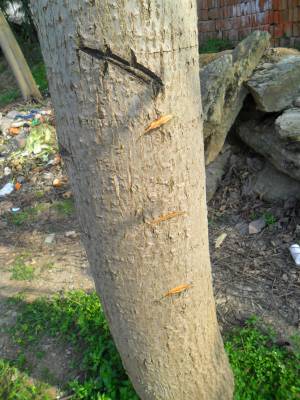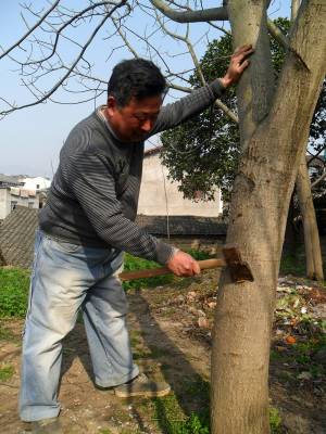 2013年3月5日是惊蛰节,宜昌市夷陵区分乡镇分乡场村杨正建正在骟核桃树。 分乡镇盛产梨、核桃等水果,有些树特别是核桃树由于营养过剩只开花不结果。为了增果稳果,农人在惊蛰节这天有騸树的习俗,寓把公树变为母树。其方法是:用斧或弯刀在树蔸上方轻砍3斧(刀);有的是将3颗铁钉烧红钉入上述部位,并念道:“惊蛰騸惊蛰騸,你的不騸我的騸。惊蛰节惊蛰节,你的不结我的结。你的结一个掉一个,我的结一个算(成熟)一个”。2014年,此习俗仍被五成老年人传承。(本报视界网 袁国悦摄)
