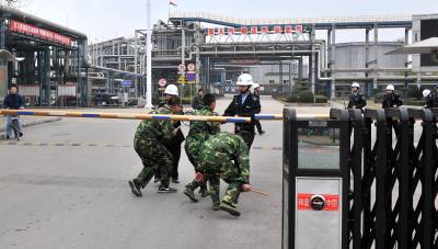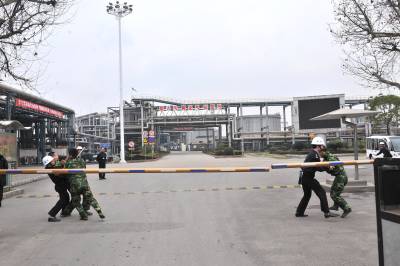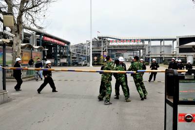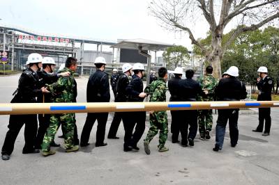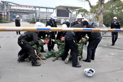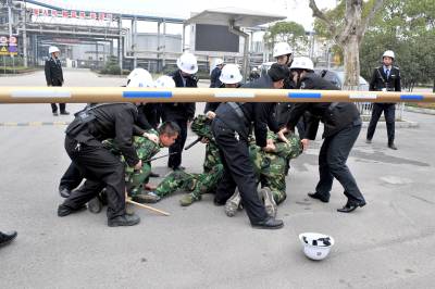 2014年3月7下午,武汉石化西大门报警有三名身份不明的人士,手持棍棒要冲击武汉石化门卫进厂搞恐怖活动。公司反恐小队及时赶到现场用几分钟制服三名恐怖分子。武汉石化是武汉市29家重点防恐单位之一,在昆明3月1日恐怖事件以后,武汉石化立即组织了厂区内和周边反恐防恐小分队,由厂保卫处护卫队20多么队员组成,他们经过专门的训练在厂区随时待命,只要有恐怖袭击就立即赶到现场。图为反恐防恐小分队在演习中制服了冲击厂区的恐怖分子。 摄影 岳力克