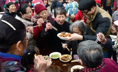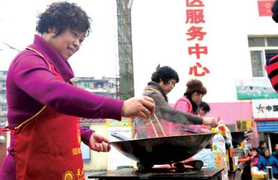 图一:俏主妇现场厨艺比赛。图二:居民争抢品尝比赛菜肴。