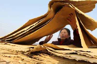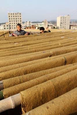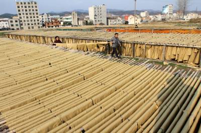 3月8日,房县城关镇晓阳村农民在晾晒野山毛竹制成的火纸。该县盛产毛竹,野生杂灌林覆盖面积广阔。这些土特资源开发利用率低,为转化成农民增收渠道,这个县正确引导农民将杂灌树枝加工成木屑,生产袋装黑木耳、香菇,将毛竹制作成火纸。通过对沉睡在大山深处的土特资源开发,让无生问津的毛竹、杂灌木转化成“黄金”。目前,全县年实现生产耳菇10000吨,加上深加工毛竹,农户年实现收入达2.6亿元。