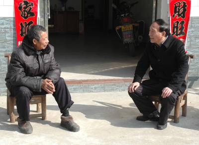 “杨老哥子,我是县委书记老艾,今到你家来,是请你给我们的工作提提意见。你有啥想法,只管说,莫客气。”3月9日上午10点半,谷城县委书记艾文金利用星期天,独自来到石花镇小坦山村2组杨宗勤家,向76岁的老组长杨宗勤征求群众意见。杨宗勤也没客气,开口就说村里东干渠涵洞口小了好堵,潭口水库一放水就淹村民的地。下午,艾文金就找来了县水利局负责人到村研究,现场解决了群众揪心的事。这是艾文金(右)在听杨宗勤提意见。