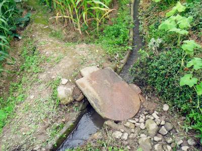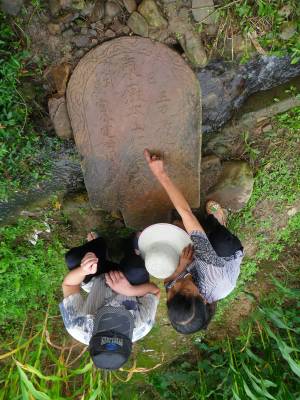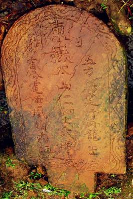 2006年,分乡场村刘家冲的村民在蒋家屋场河边兴修U型渠时挖出一通石碑,当作过桥石盖在渠道上,2013年被作者发现。石碑系阴刻求雨碑,宽1.9尺,高2.4尺(底座5寸),厚3寸,顶为半园形。碑靣正中竖书“东嶽太山仁埾大帝”8字,东嶽贰字左右分别书“日”“月”两字,两字下方分别竖书“五方得道行雨龍王”、“雷公電母風伯雨師”,碑文四周刻有流水图案。(本报视界网 袁国悦摄)