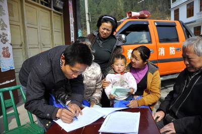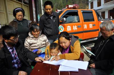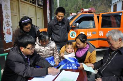3月10日,恩施市红土乡林业站工作人员正在该乡乌鸦坝村入户发放《森林保险单》。